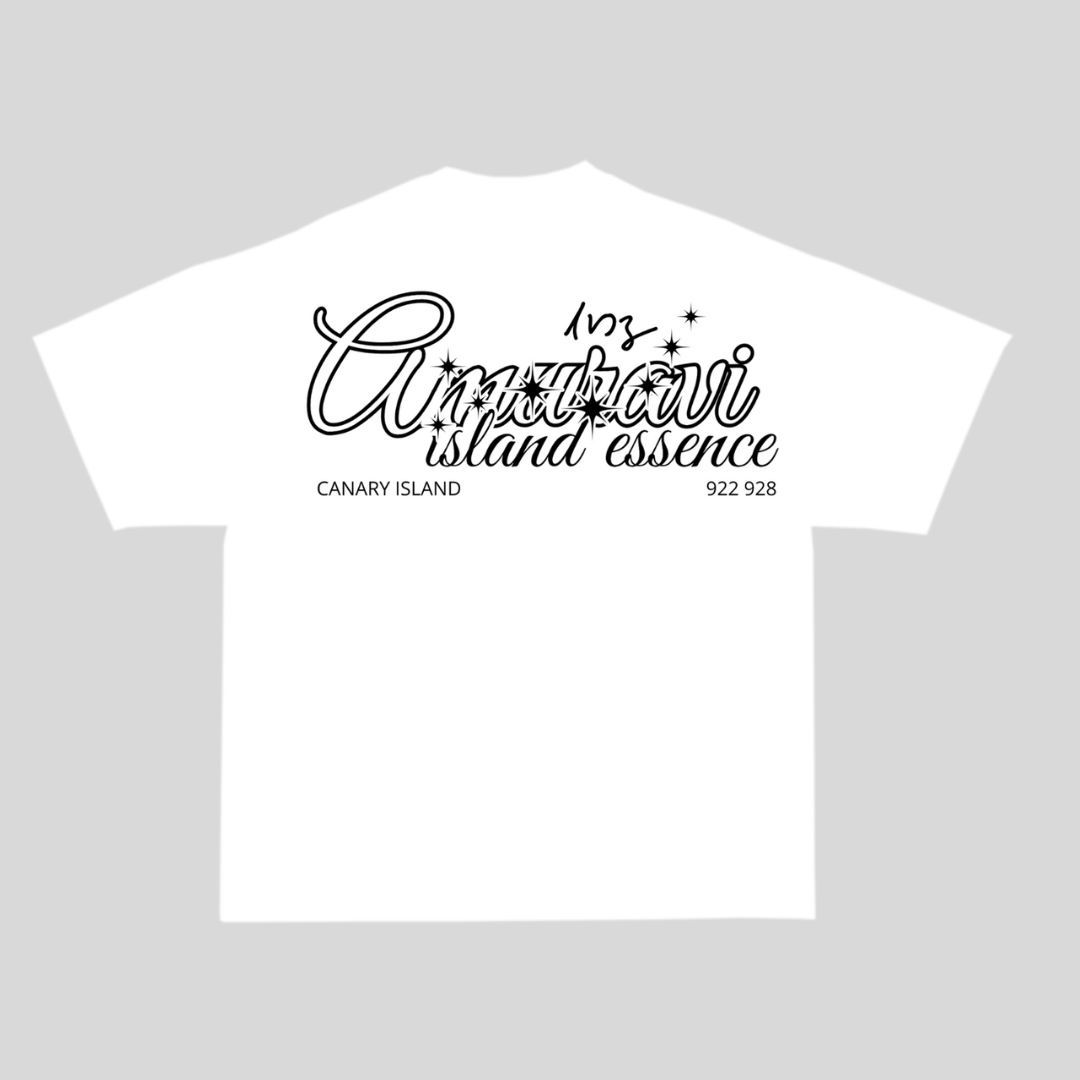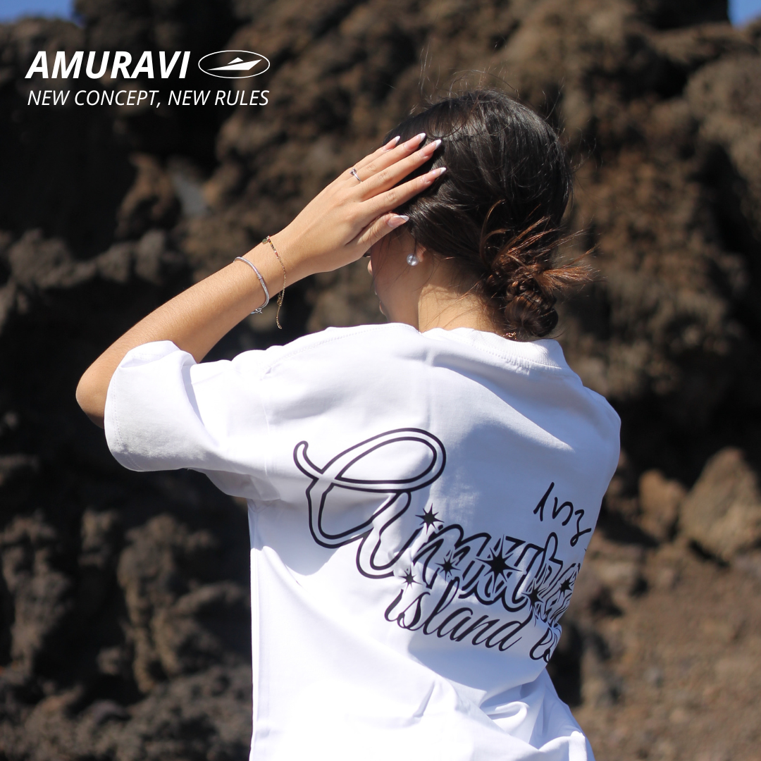 Camiseta oversized blanca, hecha de 100% algodón y con un peso de 305 gramos. Incluye el logo ¨Amuravi¨ en la parte frontal y una referencia a la colección ¨Island essence¨ en la parte trasera, adecuada para cualquier tipo de conjunto, cómoda y de alta calidad.
