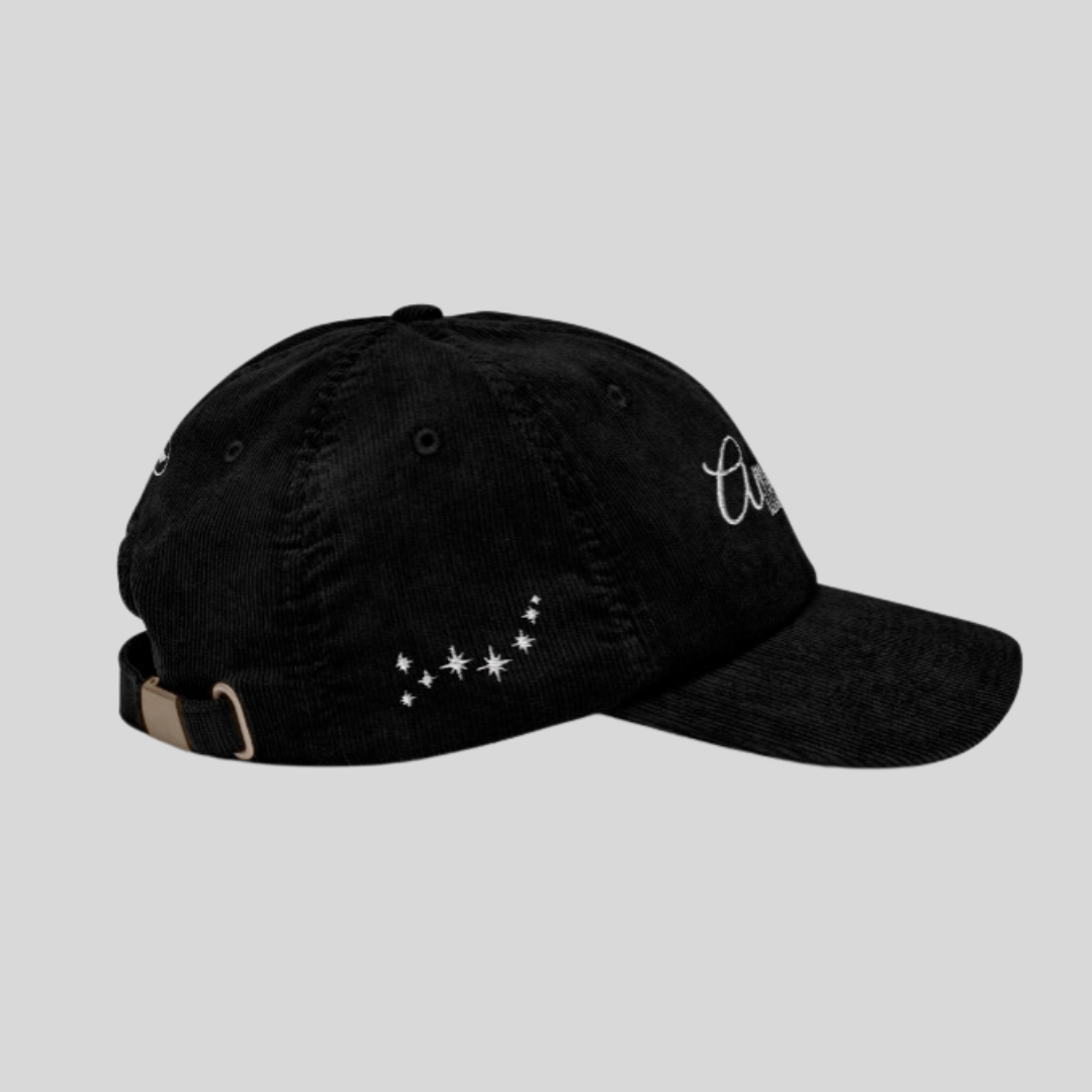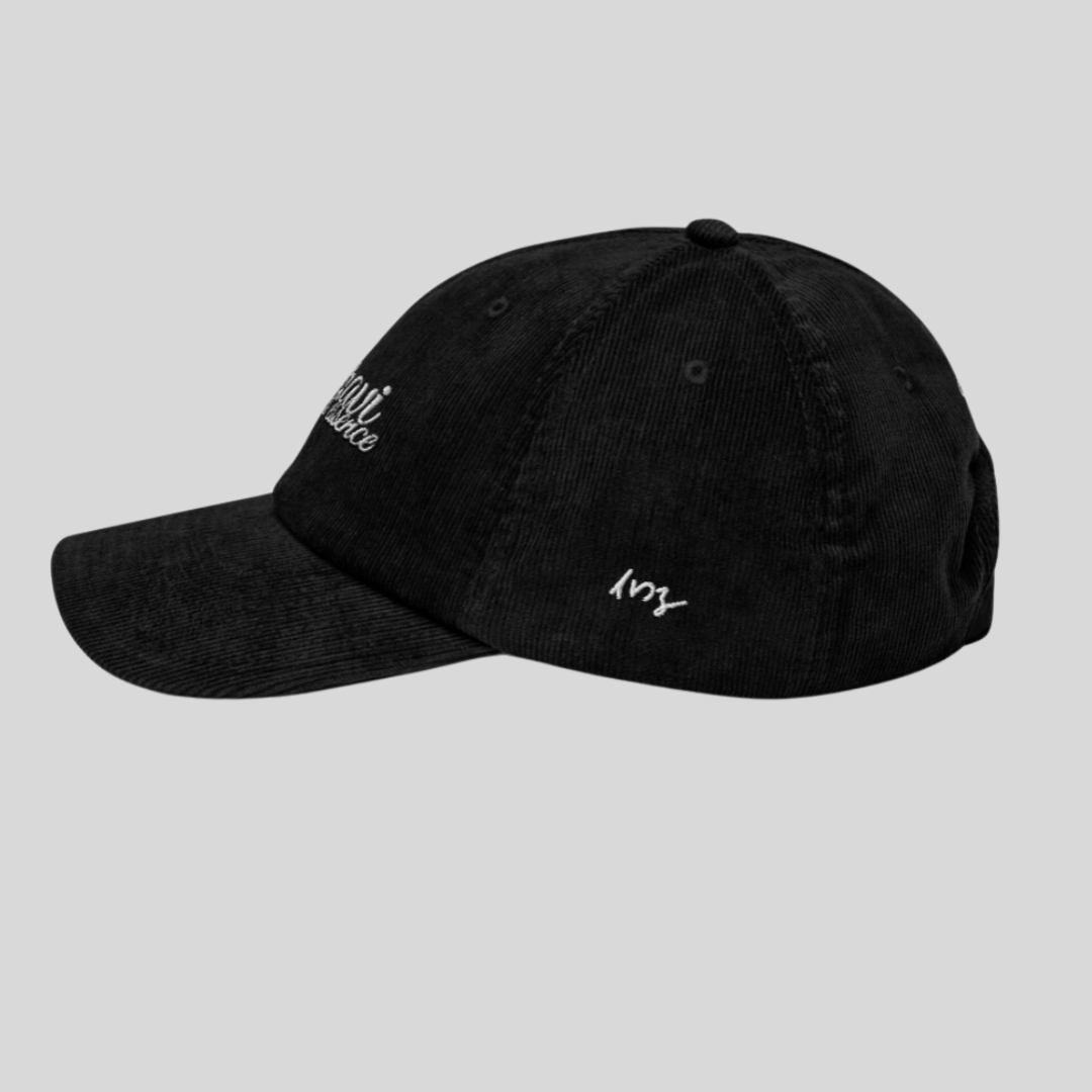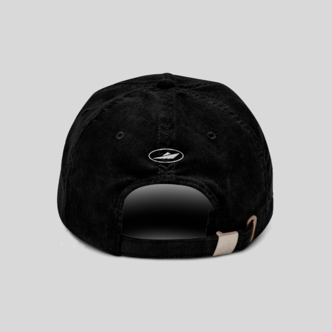 Gorra de pana negra, seis paneles, ajustable, hecha de 100% algodón y con un peso de 90 gramos. Incluye cuatro bordados de alta calidad haciendo referencia a la primera colección de la marca ¨Island essence¨, adecuada para cualquier tipo de conjunto, cómoda y de alta calidad.